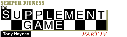 If you want to find out more about some of the supplements that we’ve profiled, take a gander at the Sports Supplement Review. This supplement book can be ordered through the bodybuilding magazine; MuscleMedia 2000. Well, that’s all from Semper Fitness this issue. Good luck playing the Supplement game. Once again, stay pumped, stay motivated and OO-RAH!