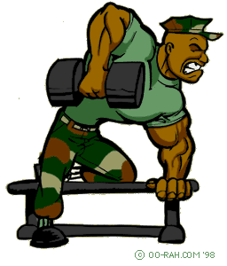 The third exercise we're going to do is one-arm dumbbell rows. This is a good mass building exercise. This exercise will be done in the same set-rep scheme as pull-downs (one warm up, two heavy). To start, kneel on a bench with one knee, keep the other leg straight. Bend at the waist with your back relatively parallel to the bench. Brace yourself with the arm that is on the same side as the knee that is on the bench. Grab the dumbbell with the working hand, making sure that your lat feels the full stretch of the weight. Pull the weight upward and to the rear. As you pull the weight up towards your outer hips, push your chest out to get maximum contraction in the lats. Always ensure that your elbows point to the rear and not out to the sides. The final exercise that we'll be doing is seated cable rows. This exercise will help you with all-around thickness and width. Sit on the seated cable row machine with your feet on the pads. Make sure that your knees are slightly bent. Lean forward and grab the bar (handle), feeling the stretch in the lats as you hold the bar. This is your start position. As you pull the handle to you, arch your back and push your chest out. Pull the handle to a point as close to your waist and belly button as possible. As the handle nears your torso, squeeze your lats tight. Keep your elbows as close to your sides as possible when pulling the weight back. Return to the start position. Do this exercise in the same set-rep scheme as the other exercises (one warm up, two heavy, total failure). This concludes the V-shaped back building workout. Good luck in the gym. Next time, we'll be working the biceps and triceps. Gotta build those guns. Well until next time from Semper Fitness, stay motivated, stay pumped and OO-RAH! Semper Fi.