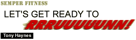 o-rah and Semper Fidelis from Semper Fitness. It's a New Year and a new millennium. I'm sure many of you have made those New Years resolutions and have pledged that you will get yourselves in shape. Well, here at Semper Fitness, we want to help you achieve that goal. In order to assist you in your quest for that physical satisfaction you crave, the series following this article will take you step by step in the process of getting started. We will start with the art of motivating yourself and discuss many aspects of the process, to include times to workout, foods to eat, and the best ways to balance your anaerobic and aerobic workouts. However, before we begin the series, I would like to start the new millennium by helping out a few of our readers that requested my help. Several readers e-mailed us and asked us to help them with running. Being the type of individual that disliked running in the beginning, I can understand their plight. So let's begin.