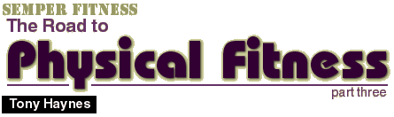 o-rah motivators. This is the extremely motivated Tony Haynes and it's another fine day here at Semper fitness. Last issue we started on the nutrition aspect of physical fitness. I cannot stress enough the importance of nutrition in the persuit of physical fitness. This issue we'll discuss the energy nutrients more in detail and we'll talk about contemporary fad diets. Let's jump on the bandwagon and get to cruisin'.
