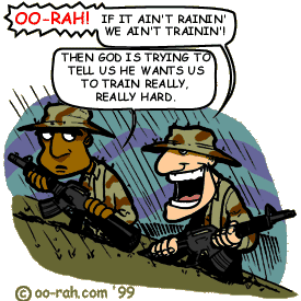 Resigned, we located a slight bowl shaped depression just east of the slag heap.İRegiment immediately sets up camp, smack on top of that slag pile, and the next day we move out from Camp 15 to our new positions. Of course, as any Reservist will tell you, when in the field "if it ain't rainin', we ain't trainin!" On cue as we reach our new positions, it starts to rain. In the desert. With the wind blowing 20-30 mph. With the temperature hovering at 40 degrees. It rains for three days. Hard. Heaviest rain in Saudi Arabia in 75 years. Now I must tell you, that my Battalion is made up of Marines from Louisiana, Arkansas, Tennessee, and Alabama and us southern boys were downright cold, wet and miserable. We were supposed to be fighting a war in a desert -- no one told us about bringing rain and cold weather gear! Within all this misery, though, was a soul warming sight (and a silent gratitude from all of us on the Bn. Advance Party). That slag heap that Regiment camped on was composed of 25 years of dust, dirt, sand and had never really been wet. Now it was wet. And muddy! A grey, clay like, cloying mud. It literally could not support man, vehicles, or tents. Pallets oozed into the mud after a couple of hours on the ground. Anyone moving across ground sank to the crotch. The road was impassable. Officers and enlisted alike had to try to scale the sides of the hill to reach the top, practically doing a breast stroke to make it up the side without sliding back! It was a distinctive badge of grey smear and surly attitude that all Regimental HQ members wore for the next week or so. While all of us were from the south, and most of us were country boys, to some extent, we still had some naive Marines among us. One of these was our Dragon Platoon Commander, whom I had talked into joining the Reserve Infantry after he left active duty.İOn active duty, however, Captain Tom was an Aircraft Maintenance Officer. He had grown up in a medium size Louisiana Cajun town, but was a typical college fraternity type who joined the Marine Corps to be a pilot, but was forced into another MOS due to a small deficit in his eyesight. Oh, and he was quite fastidious about his hygiene (i.e. didn't like to get dirty!) One of the things that used to be great about the Reserves, was that we didn't care what your MOS was, if you could fit into a job, you could earn the new MOS (and Tom turned out to be a good grunt officer)! Anyway, one day while at the Rock Quarry a number of Platoon Commanders and I were standing around in conversation when Captain Tom walks up with a number of objects in his hands. "Hey, look ya'll," he says, "some kind of nuts! They grow on the ground and are all over the place!" "Uh, Tommy, those aren't nuts." I replied. "Yeah they are, hickory nuts or sumthin." The other Platoon Commanders are rolling their eyes and laughing uproariously by now. Tom is incredulous and stunned at their reaction. "Tom, that's camel dung." "No, it's NOT! It's a nut of some kind." "Tom, you ever seen rabbit pellets?" "Look, I'll prove it. I'll open one up!" (One Plt. Cmdr. has fallen to the ground laughing so hard.) "Don't do that..." To which a couple break open... with the recent rains, and that it was probably fairly fresh dung, it got all over his hands and was quite pungent to boot. The horrified look on Tom's face had all of us at this time in tears and most of us on our knees from laughing. We neared exhaustion for being unable to catch our breath! Tom became a quick learner in field craft. He even learned to ignore our snickers when, after we'd run out of MOGAS for our pack stoves, we'd gather camel dung to burn and boil our coffee (Communty Coffee...we are from Louisiana after all)! Semper Fi! Have a sea story you want to see published on our site? Send it here!