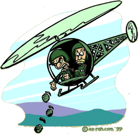 In the middle of my tour, Captain Q. was rotated in as our Battery Commander, and his elevator didn't go all the way to the top if you know what I mean. It got to the point where he would stand next to the outhouse on Malaria pill day so he could be saluted (for those of you who have not had the pleasure of taking Malaria pills, they cause severe diarrhea for a short while after being taken). One day Cpt. Q. got use of a LOCH (the little chopper that looked like a bubble with blades) for a few hours and decided he wanted to go hunting VC (you know, the bad guys). He tried to recruit a grunt (infantry) to sit in the back as a machine gunner, but was unsuccessful. He left the infantry area muttering that he would come back to the Artillery Battery and ORDER Cressman to go with him To this day I don't know why I was "the chosen one". Was it because of my yellow socks (hey, give me a break - they were the only dry ones I had that day), or maybe my mustache which was perpetually "unkempt" (by HIS standards)?