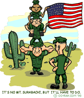 The next day the colonel came by and called for the lieutenant. The colonel congratulated the lieutenant on the fine job he had accomplished with the flagpole being raised with the good old "Stars and Stripes" flying proudly. Being astute, the colonel said, "Lieutenant, I not only congratulate you, but I have one burning question. Just how in the hell did you find the materials to raise this flag pole?" The lieutenant's reply was a Marine Corps classic. "Sir, credit must be given to the First Sergeant, ... for it was he I gave the order to have your wishes fulfilled." The colonel asked the lieutenant for clarification. His reply was, "Sir, being a Mustang, there is one thing I have learned, ... there isn't a damn thing in the world you can think of that a Sergeant Major or a First Sergeant of Marines cannot do." I believe this story originated from a question asked in Basic School at Quantico. Be it true or not, the gist of the story is a truism if ever there was one. Semper Fi! Editor's note: The correct answer to the question at TBS is, "Gunny, ... put up the flagpole." We need look no further than the famous Joe Rosenthal photograph taken on top of Mt. Suribachi to know that this story is true. Thank you, George, for reminding us of our great heritage. Have a sea story you want to see published on our site? Send it here!